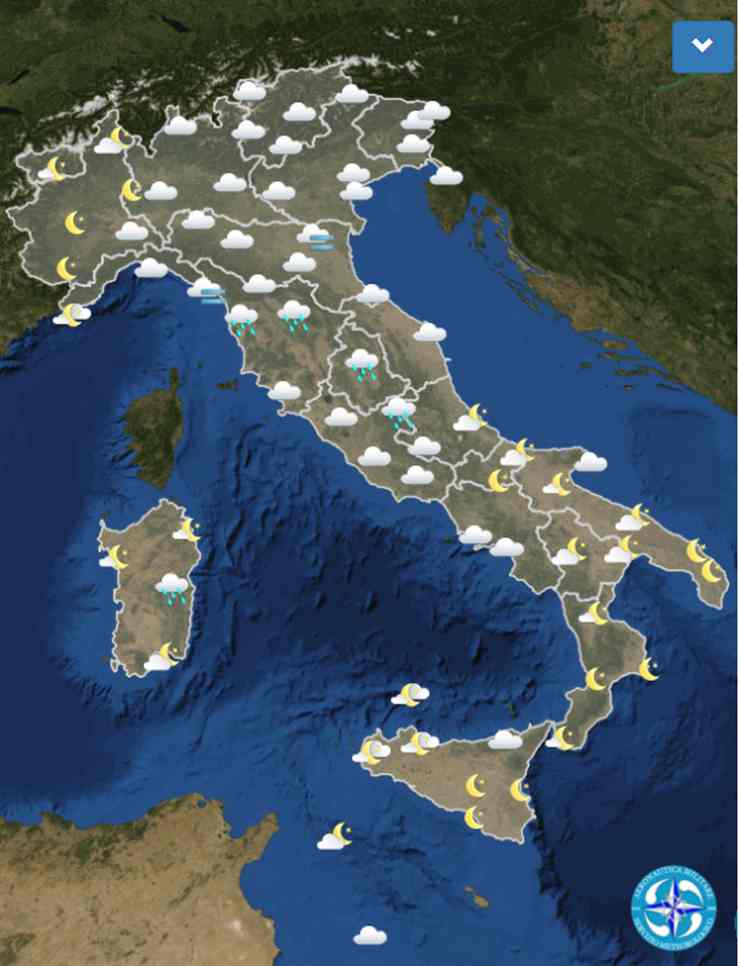 Residui fenomeni al mattino su Calabria e Sicilia, bel tempo sulle restanti aree. Ma sud con nubi in aumento sui settori tirrenici e con precipitazioni che interesseranno Campania, Molise occidentale e settori tirrenici di Basilicata e Calabria nonché, in modo più blando, la Sicilia occidentale.