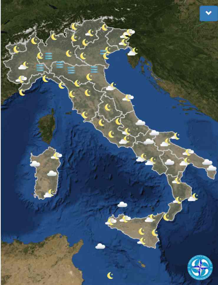 Foschie dense e nebbie anche estese sulla pianura padano veneta solo in parziale diradamento durante le ore centrali; ampio e prevalente soleggiamento sul resto del nord salo parziali addensamenti sulla Liguria.