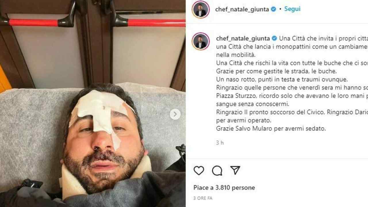 Lo chef ha raccontato sui social la disavventura che gli è capitata. «Una città che invita i propri cittadini al green, una città che lancia i monopattini come un cambiamento educativo nella mobilità. Una città che rischi la vita con tutte le buche che ci sono in giro. Grazie per come gestite le strada, le buche. Un naso rotto, punti in testa e traumi ovunque. Grazie al Comune di Palermo.
