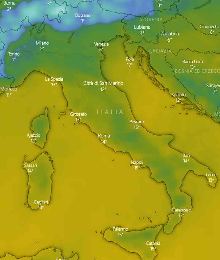 Annuvolamenti estesi e compatti su tutte le regioni associate a piogge in particolare sulle regioni tirreniche e Sardegna occidentale. I fenomeni risulteranno localmente intensi su alta Toscana.
