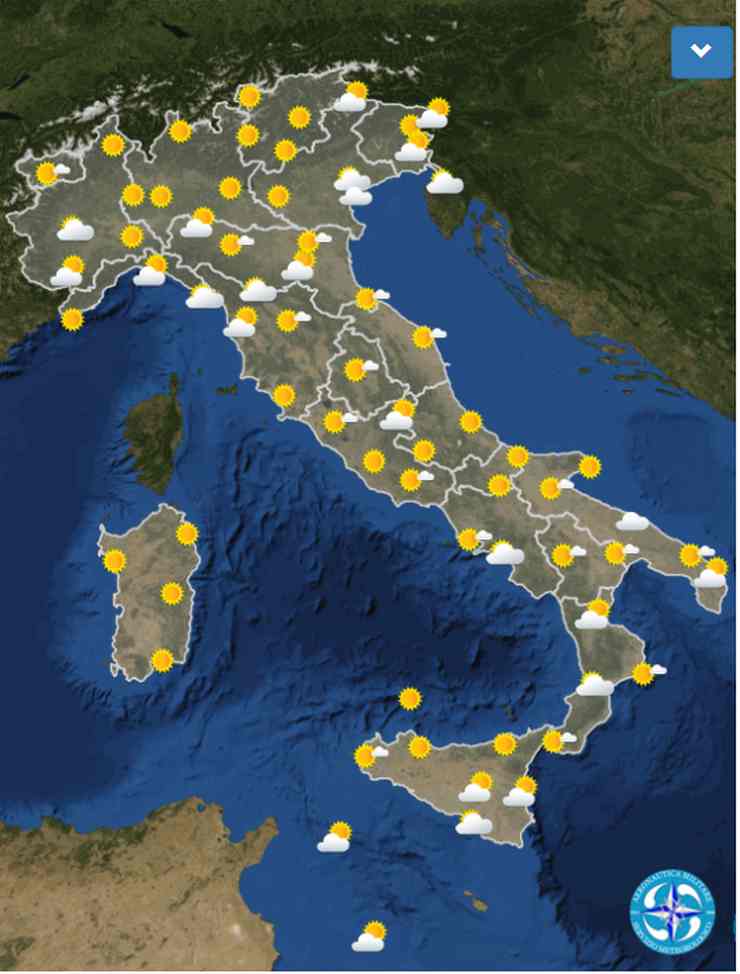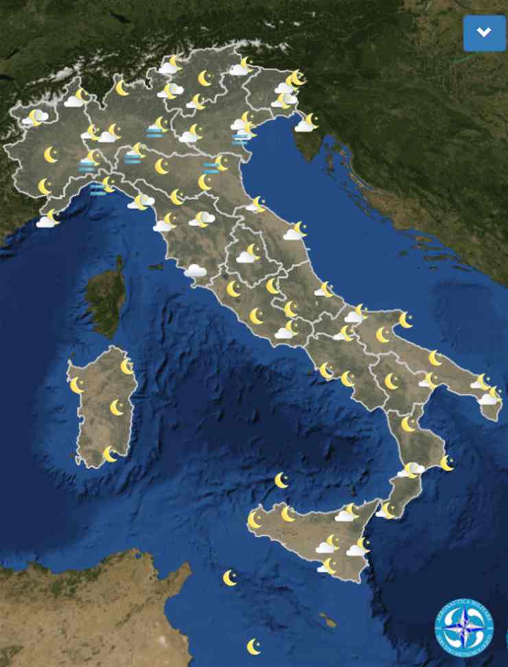 Cielo sereno su tutte le regioni salvo deboli velature in transito sul settore peninsulare fino metà giornata. Nubi basse in aumento serale sulla Toscana.