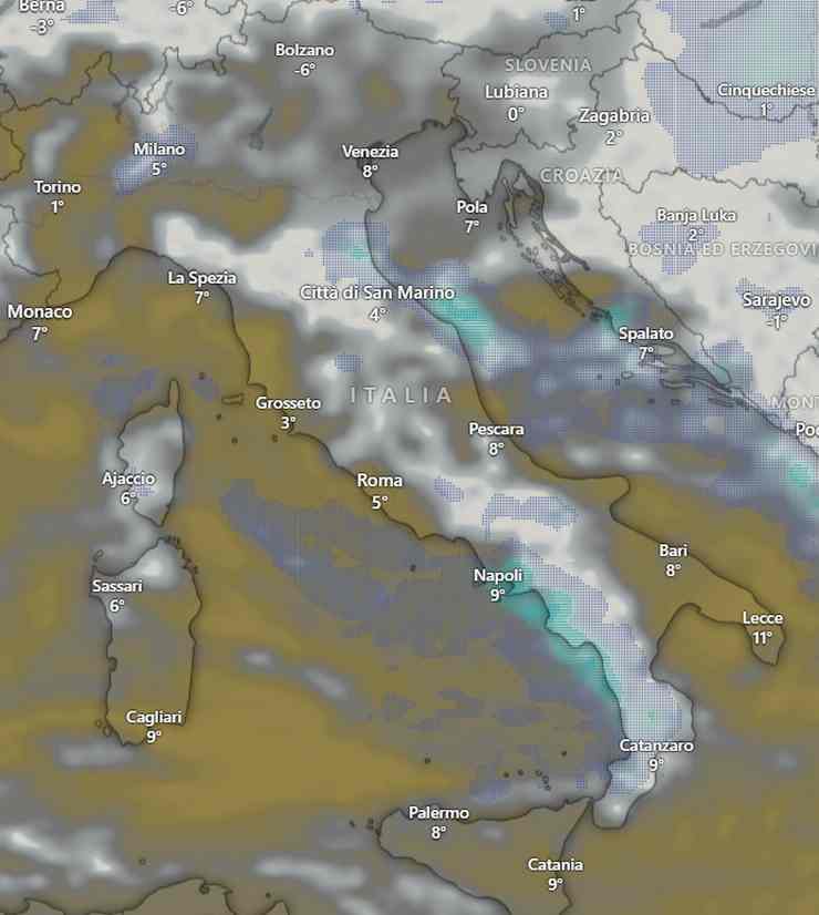 Sulla Sicilia annuvolamenti consistenti sulla porzione settentrionale seguiti da velature anche spesse, con possibilità di qualche piovasco serale sul settore tirrenico dell’isola. Inizialmente molte nubi su gran parte delle regioni peninsulari con lievi precipitazioni, più diffuse e frequenti al primo mattino su Campania, Basilicata e Calabria tirreniche, dove potranno assumere anche carattere temporalesco, mentre sulle aree appenniniche sono attese delle nevicate oltre i 1000-1200 metri. Dalla serata generale attenuazione dei fenomeni, anche con copertura meno consistente su Molise orientale, Puglia e regioni ioniche.