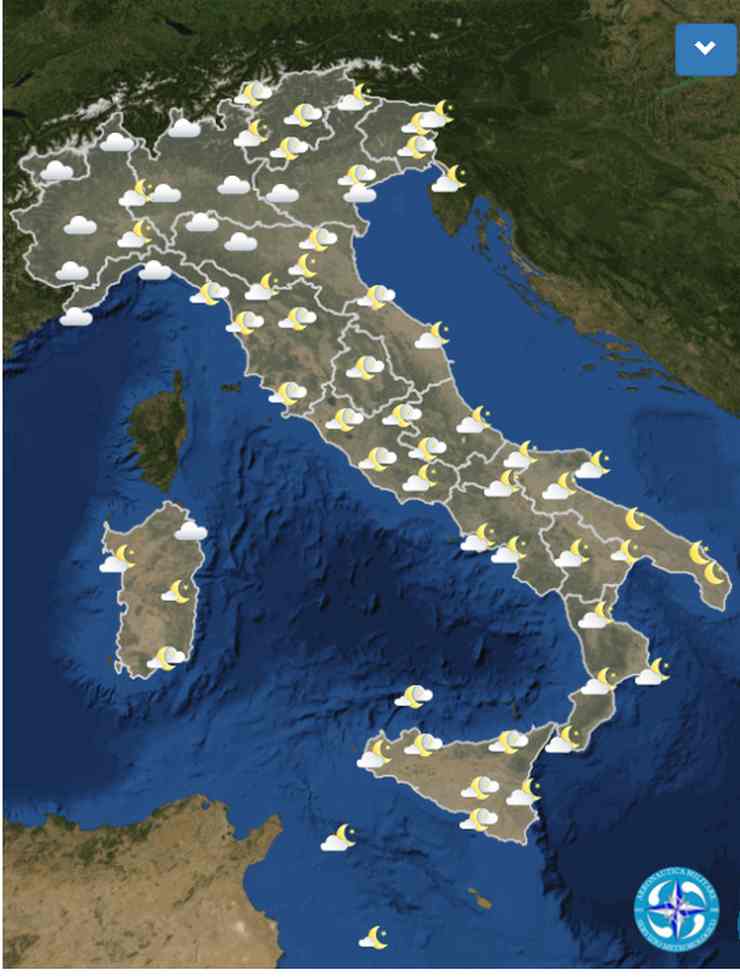 Annuvolamenti bassi e stratiformi attesi su su Sardegna meridionale ed orientale, dove non si esclude la possibilità di qualche sporadico piovasco associato; sul resto dell’isola e sulle regioni peninsulari condizioni di tempo stabile e soleggiato con transito di ampie ma innocue velature.