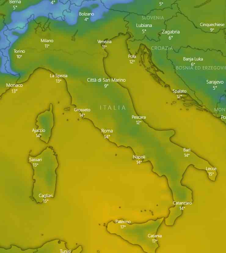 Cielo molto nuvoloso o coperto, con piogge diffuse al pomeriggio su Piemonte, Emilia-romagna e Liguria, localmente anche a carattere temporalesco su quest’ultima regione, in estensione serale anche alle aree pianeggianti di Veneto e Lombardia.