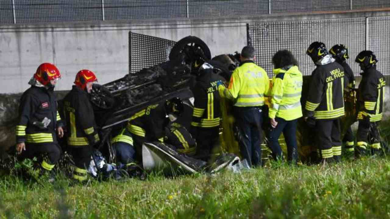 L’auto ha attraversato la rotonda e colpito il marciapiede, per poi carambolare in un assurdo volo, ribaltarsi e fermarsi in fondo allo spiazzo erboso in mezzo alla suddetta rotonda. Testimoni raccontano che avrebbero udito richieste di aiuto, perché i due uomini avrebbero cercato di uscire dall’auto mentre le fiamme stavano già ricoprendo l’abitacolo.