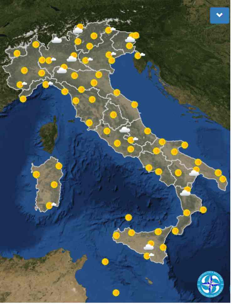 Cielo sereno o poco nuvoloso, con sviluppo di locali nubi cumuliformi sulle regioni tirreniche, accompagnate da deboli locali rovesci o temporali, al tardo mattino e primo pomeriggio. In serata locali addensamenti compatti lungo le aree costiere tirreniche peninsulari e bel tempo sul resto del meridione.