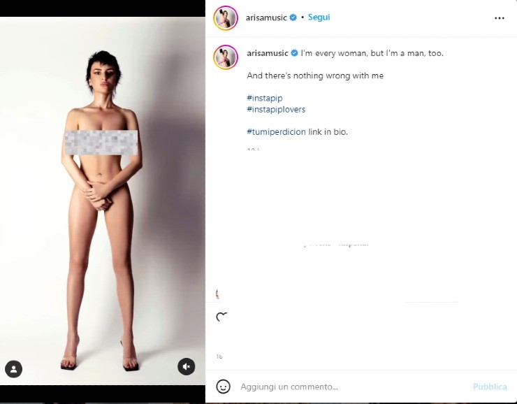 In un scatto pubblicato sul suo account Instagram ufficiale, la cantante Arisa sfida decisamente la censura mostrandosi completamente nuda. Lo scatto è diventato immediatamente virale: forma mozzafiato, capelli cortissimi, la cantante lucana si mostra in tutta la sua bellezza. Il post ha ricevuto tantissimi like. Soltanto una striscia pixellata copre il suo seno. Si legge: “Sono una donna, ma anche un uomo e non c’è niente di sbagliato in me stessa”.