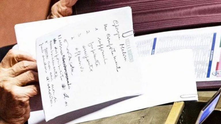 Oggi a incuriosire gli osservatori politici ci sono gli appunti che il leader di Forza Italia stava scrivendo durante la seduta a palazzo Madama che qualche immagine ci restituisce. Osservando la foto scattata Antonio Masiello, Berlusconi stava scrivendo della presidente di FdI. “Giorgia Meloni. Un comportamento 1. supponente 2. prepotente 3. arrogante 4. offensivo. Nessuna disponibilità al cambiamento. È una con cui non si può andare d’accordo“. Sul foglio l’intestazione di Villa San Martino. Negli appunti appaiono anche alcune parole cancellate, tra queste un pesante aggettivo che sembra essere “ridicola” e una riformulazione della frase “nessun cambiamento” a “nessuna disponibilità al cambiamento”.