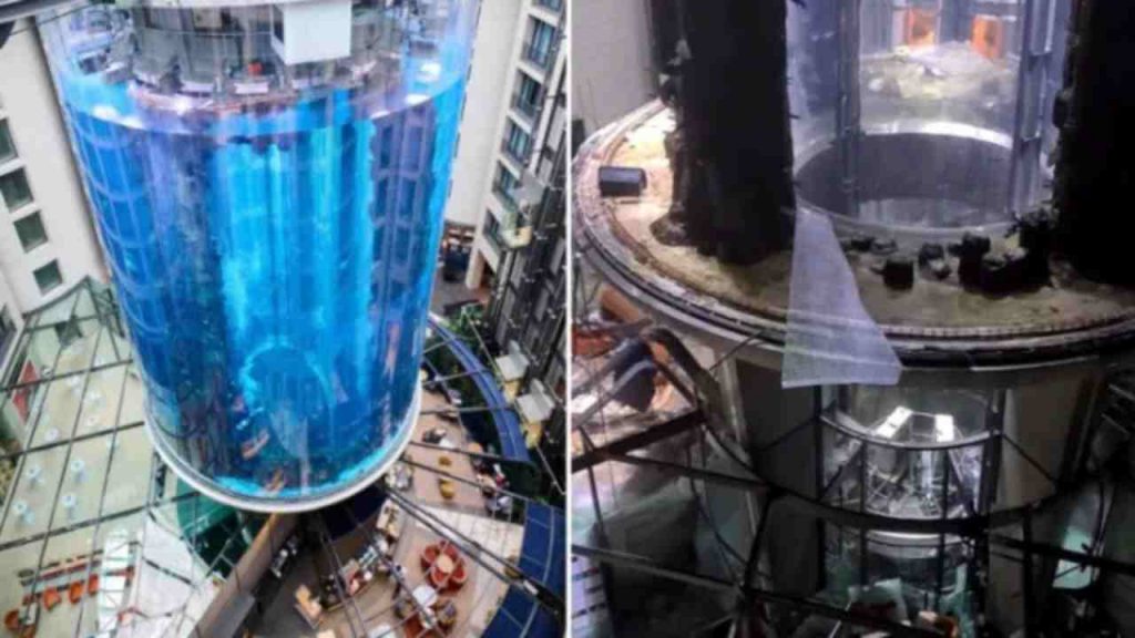 Una fortissima esplosione e il maxi acquario cilindrico di Berlino, il più grande del mondo, si è sbriciolato all’ìmprovviso.